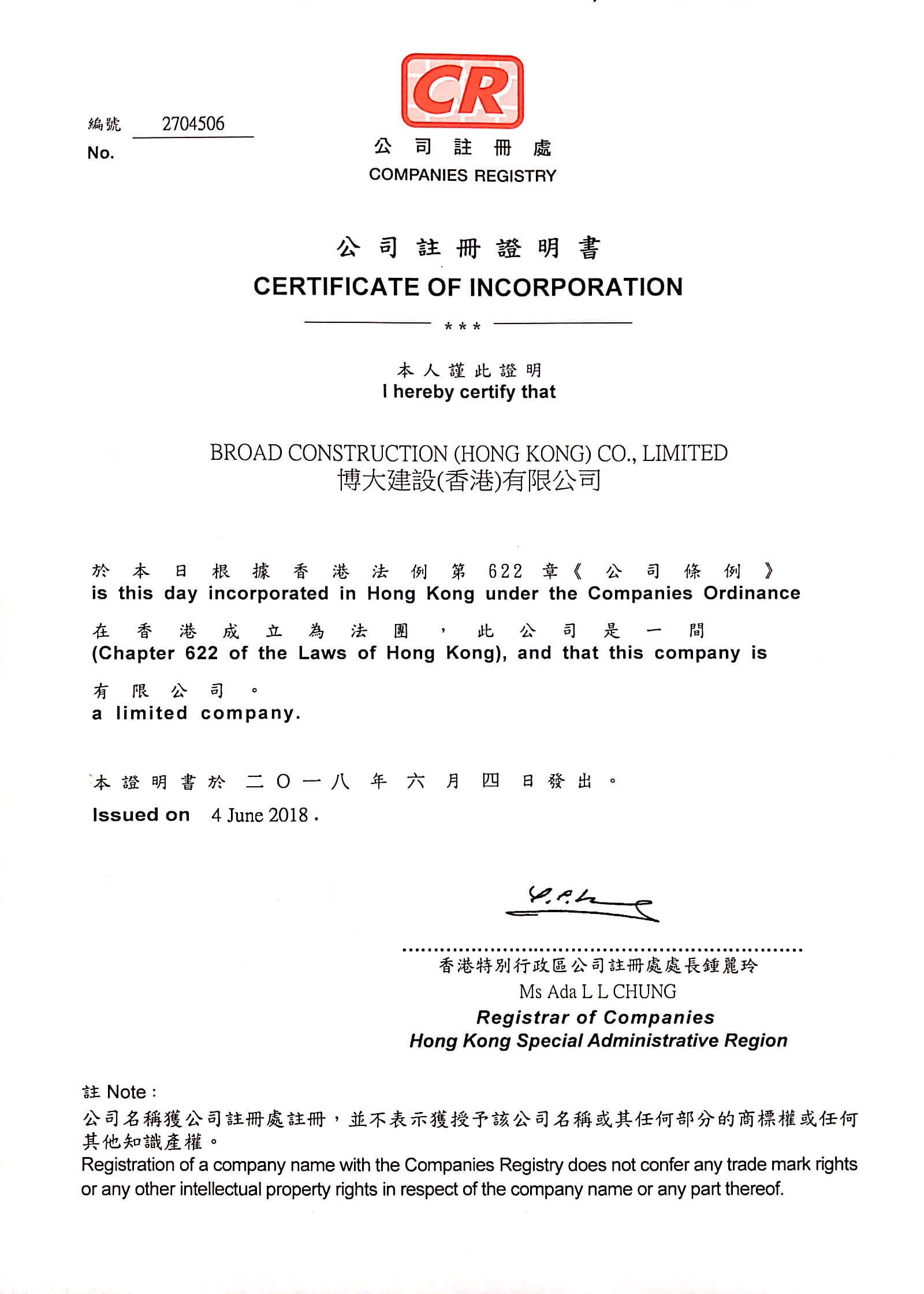 6月4日,博大建設(shè)集團(tuán)香港公司正式注冊(cè)成立,博大建設(shè)集團(tuán)總部設(shè)在深圳,加上之前成立的澳門公司,初步完成粵港澳大灣區(qū)的戰(zhàn)略布局。